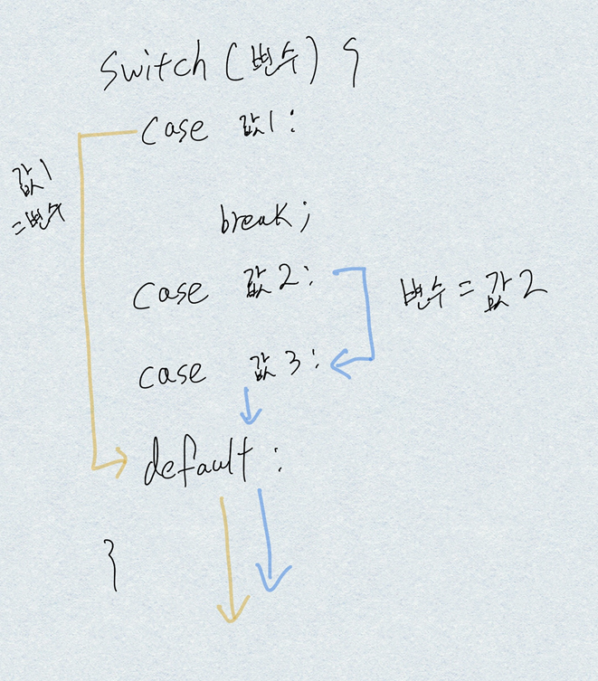 변수가 값1이랑 같은 경우 case 값1: 안에는 break;문이 있기 때문에 case 값2, case 값3이 무시되고 바로 default문으로 가서 실행 후 witch문이 끝나게 된다. 하지만 변수가 값2일 경우 case값2:에는 break문이 없기 때문에 case값3도 같이 실행되고 default문도 실행된다. default문은 값이 변수랑 일치 하든 안하든 무조건 실행된다고 생각하면 된다.