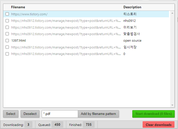 웹페이지를 들어간 다음에 이 플러그인을 실행하면 자동으로 파일 받을수 있는 목록이 나온다. 여기서 select를 해주고 스타트 다운로드를 하면 한번에 다운! ㅋㅋㅋㅋㅋ 지금 글을 쓰는 도중에도 다운로드 받고 있다! ㅋㅋㅋㅋㅋ