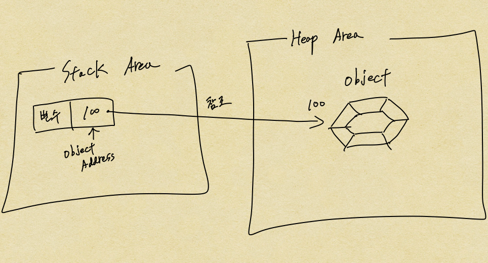 그러면 Stack Area에 변수는 객체랑 연결이 되어야하는데 그 연결을 할 수있는것이 주소값에 100이 저장되면서 객체를 참조하고 있다.