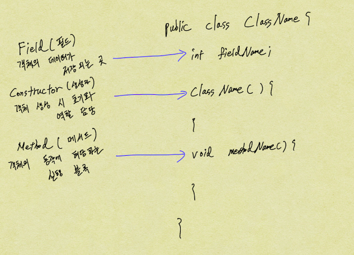 필드 초기화, 메서드를 호출해서 객체를 사용할 준비를 한다. 생성자는 클래스 이름으로 되어있고, 리턴타입이 없다.