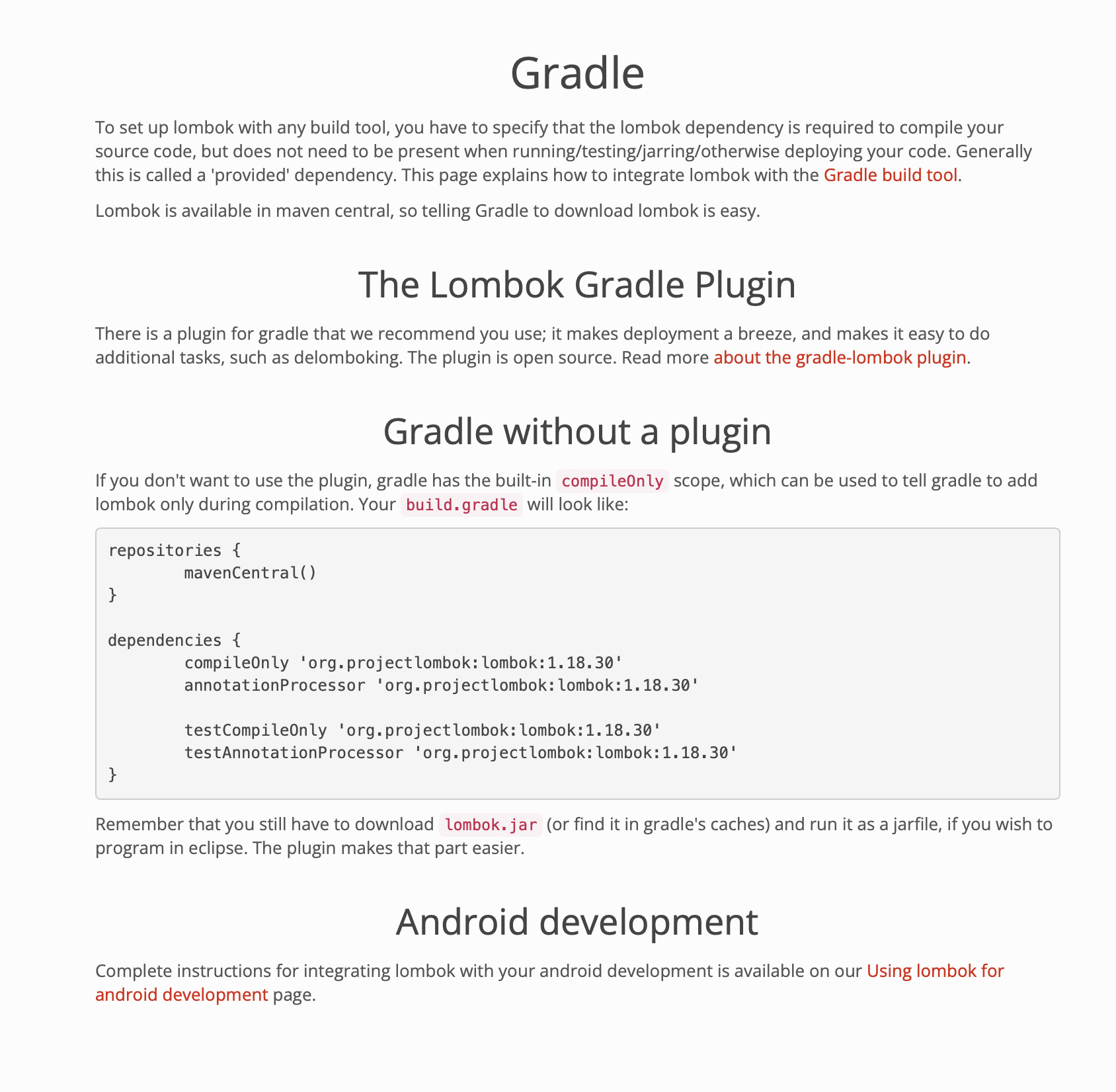위 사이트에 들어가보면 롬복 그래들로 어떻게 추가해야하는지 나와있다.