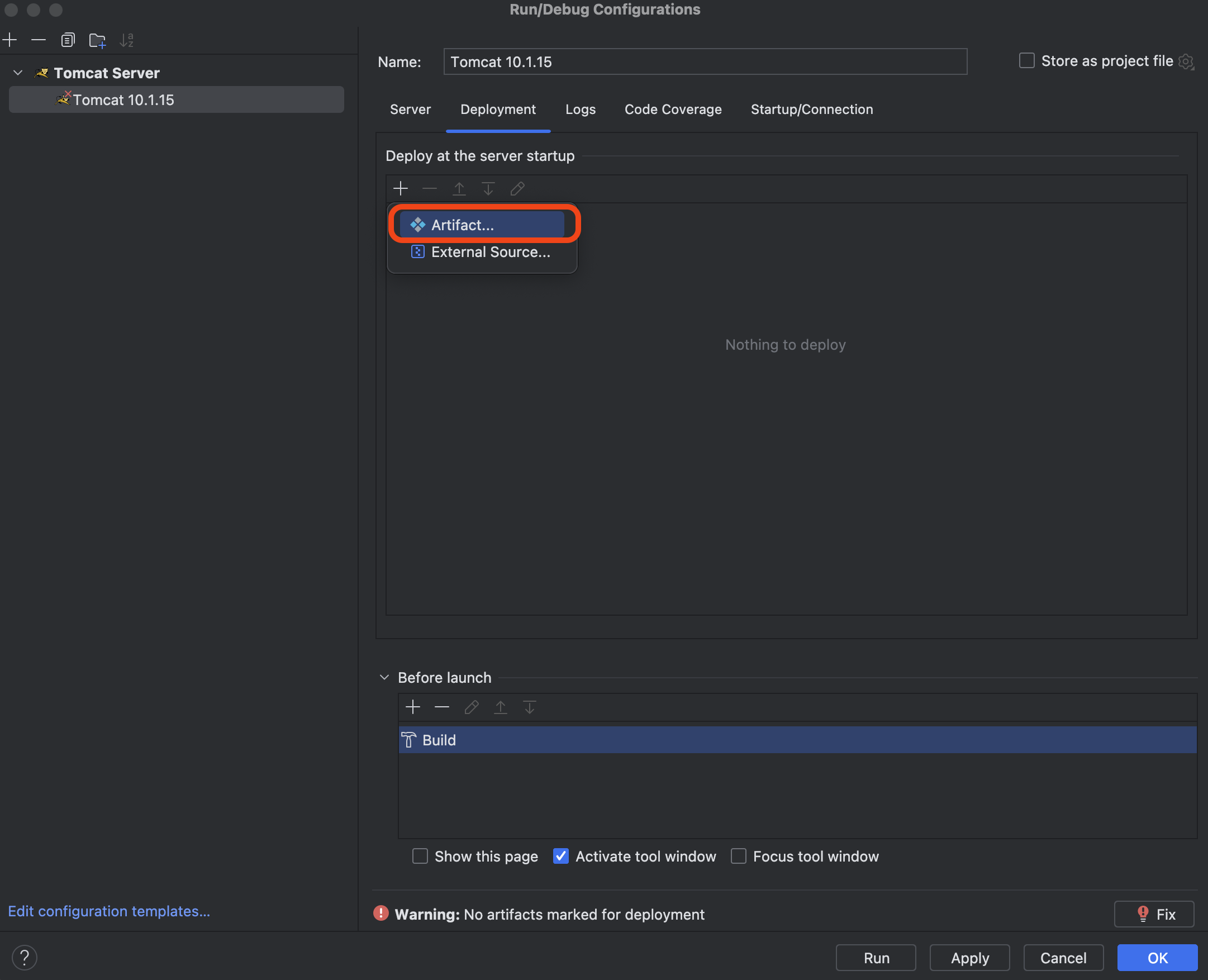 Deployment 메뉴를 클릭하고 + 버튼을 누르면 Artifact...라는 메뉴가 나온다. 그리고 그것을 클릭한다.