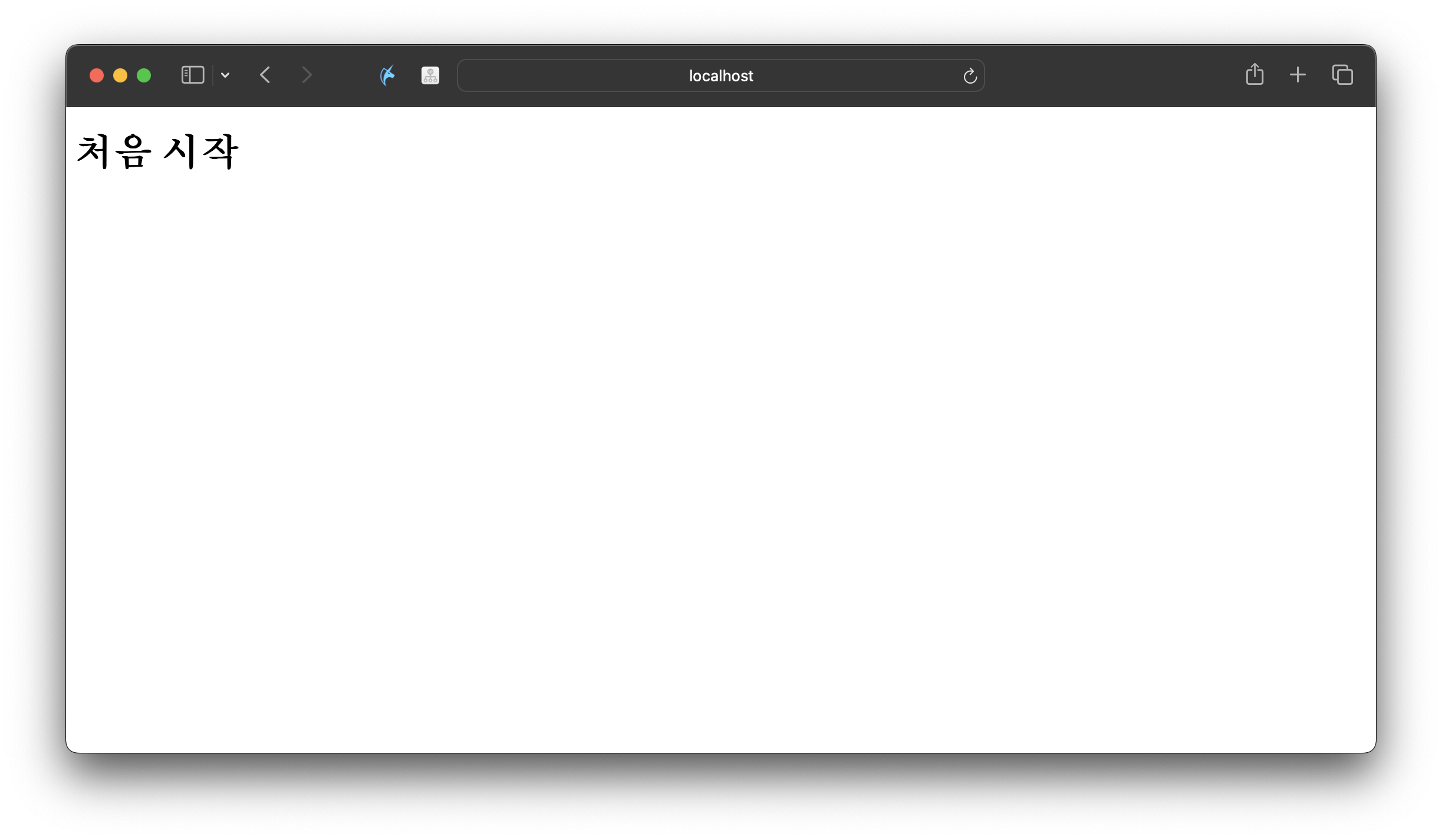 그러면 위와 같이 로그가 출력이 되면서 아래처럼 웹사이트가 출력된다. 현재 저는 webapp이라는 폴더에 index.html을 만들어서 넣어줬기 때문에 아래그림처럼 '처음시작'이라는 문구가 나오는 웹페이지가 나온다.