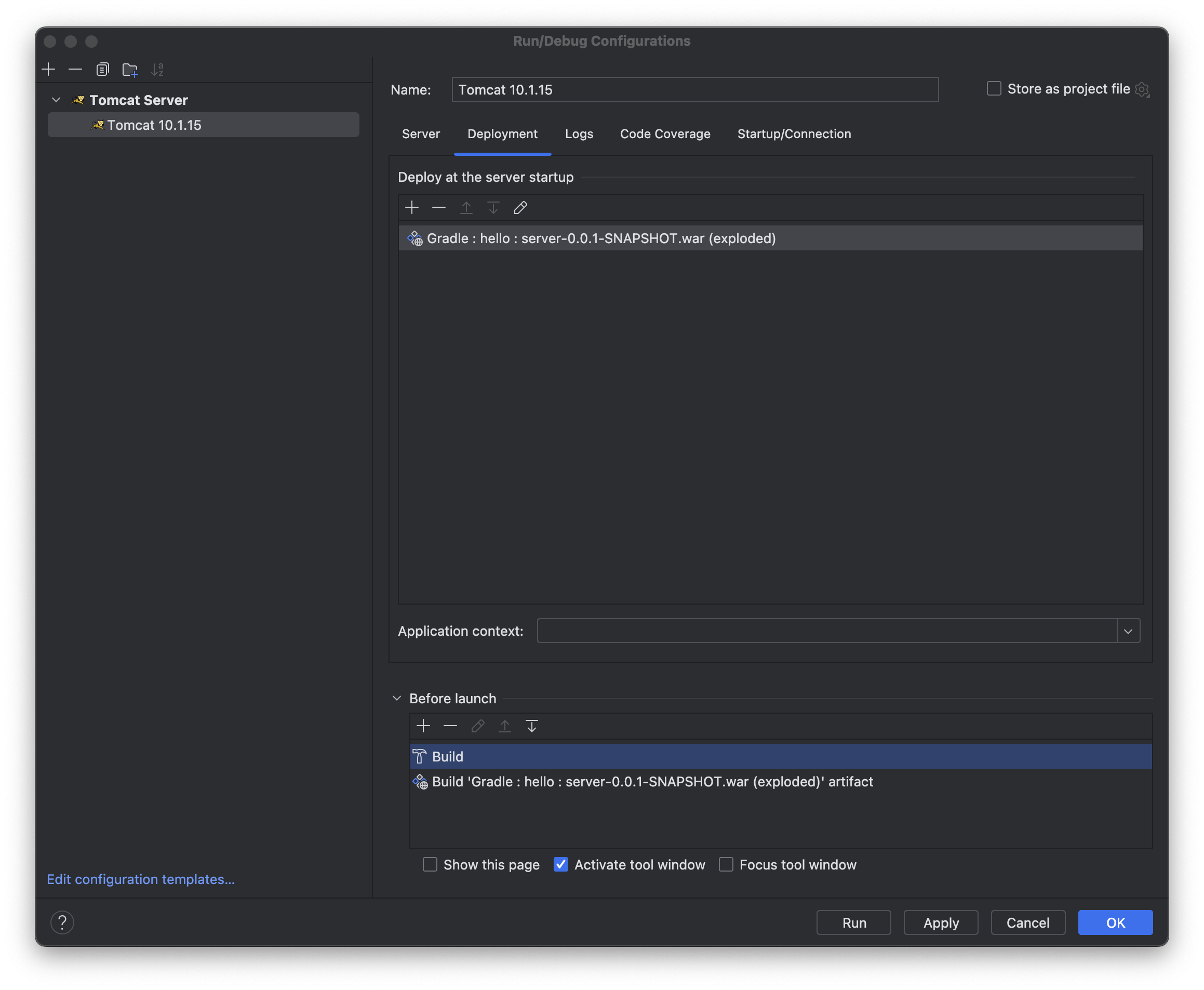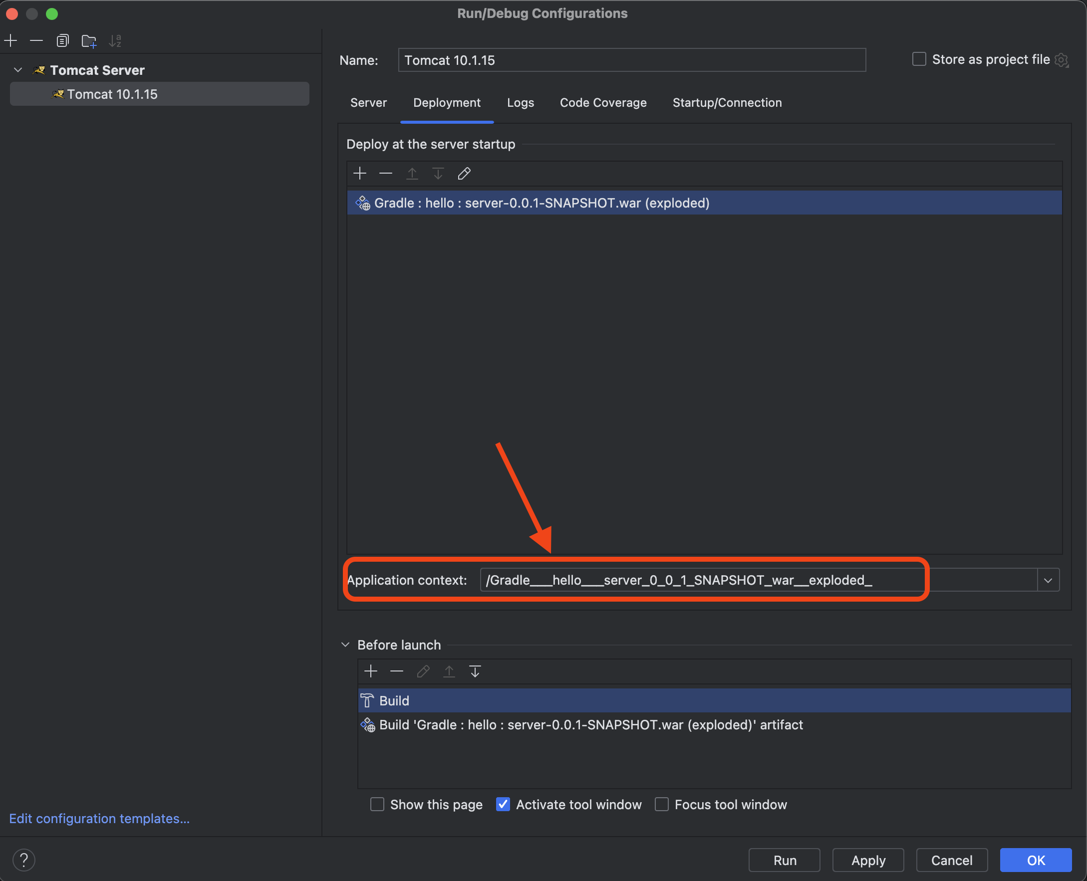 Application context 라고 쓰여져 있는 곳에 /Gradle___hello___server_0_0_1_SNAPSHOT_war__exploded_ 이렇게 쓰여있는 것을 삭제한다.