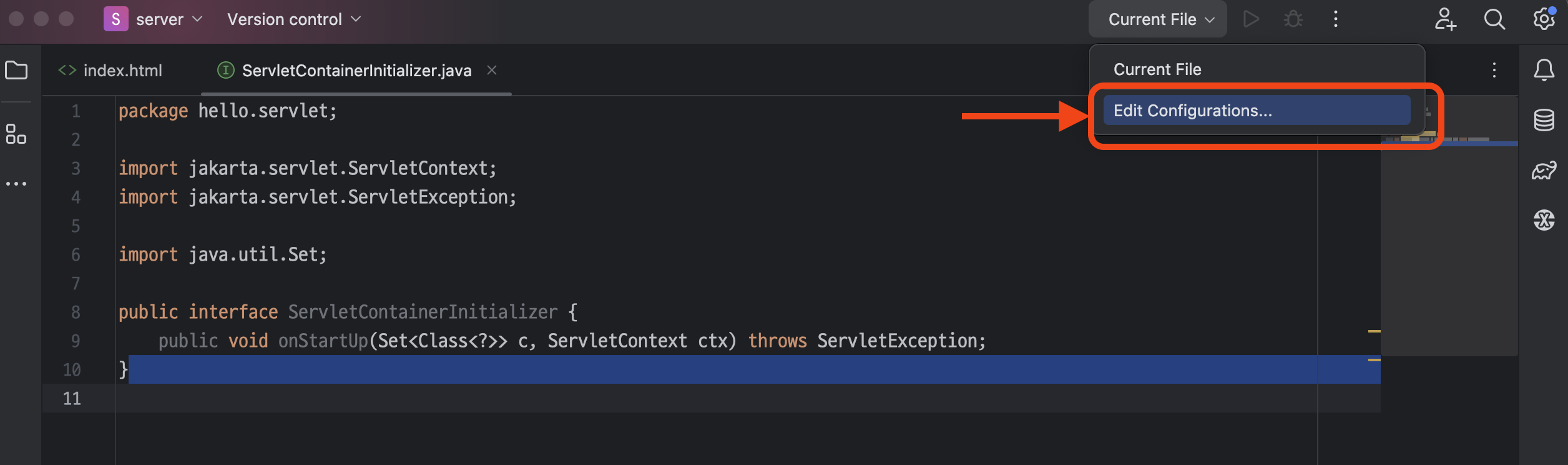 오른쪽 위를 보면 Edit Configurations... 라는 메뉴를 클릭한다.