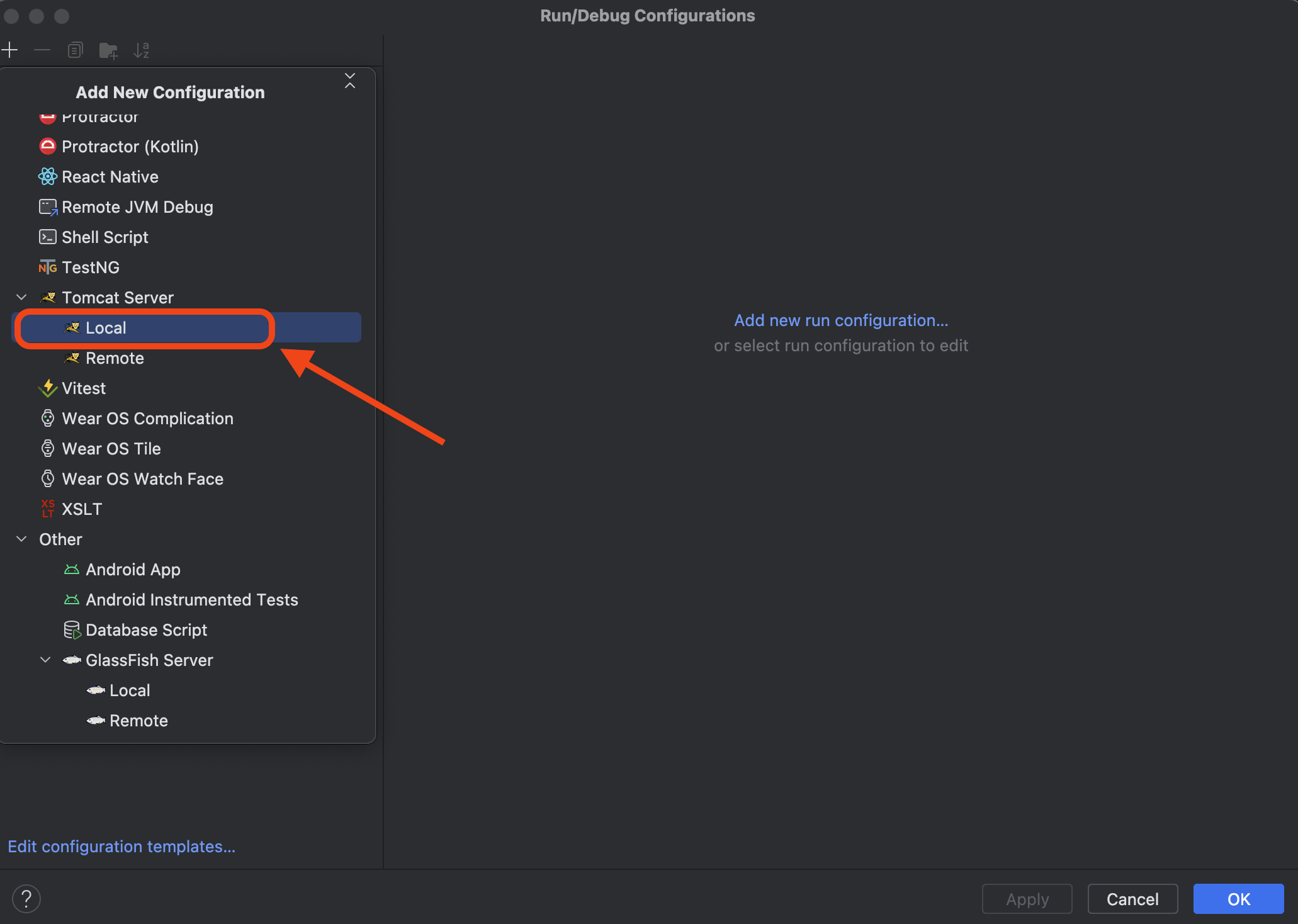 Tomcat Server 아래에 Local을 클릭한다.