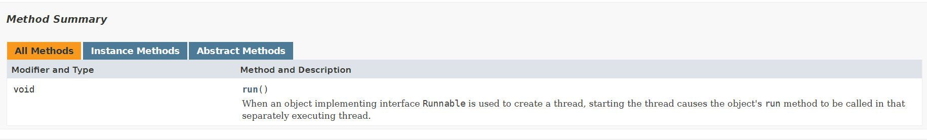 먼저 Runnable interface java doc문서를 보았다. 아래와 같은데 run method만 구현하면 된다.