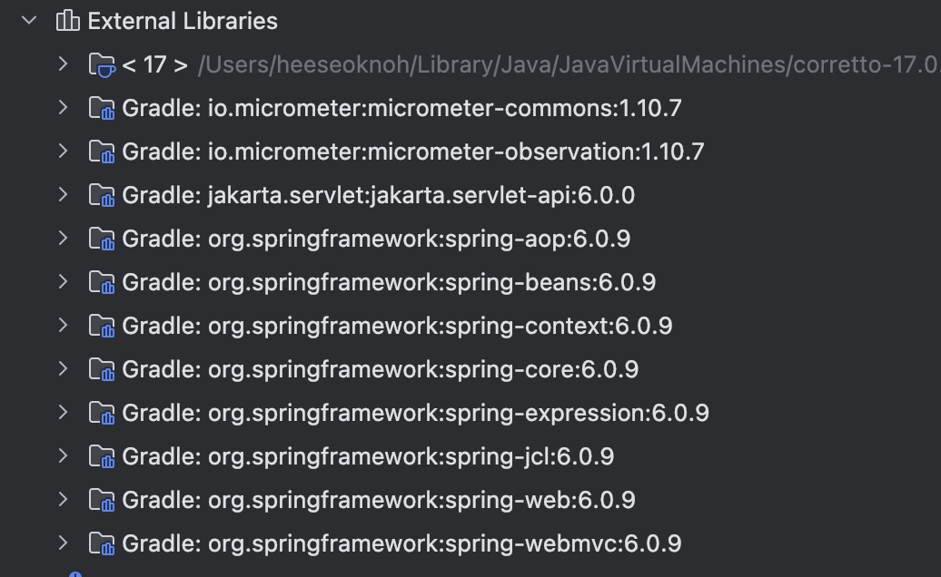 그리고서 gradle 새로고침 버튼을 누르면 스프링 관련 라이브러리가 다운로드가 진행된다. 다운로드가 완료되면 아래 그림처럼 라이브러리가 추가된 것을 볼 수 있다.