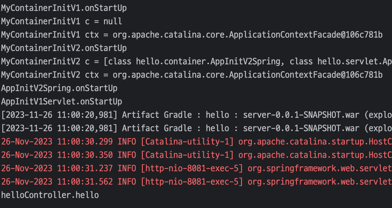 MyContainerInitV2 c = [class hello.servlet.AppInitV1Servlet, class hello.container.AppInitV2Spring]