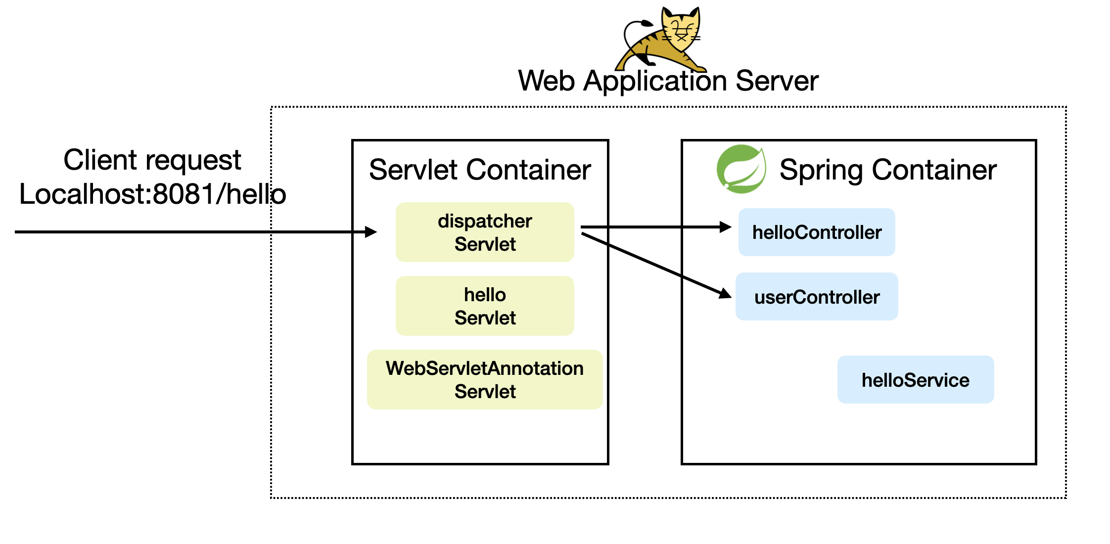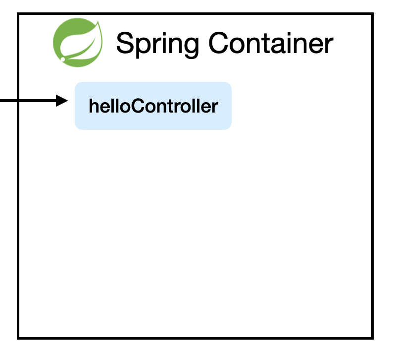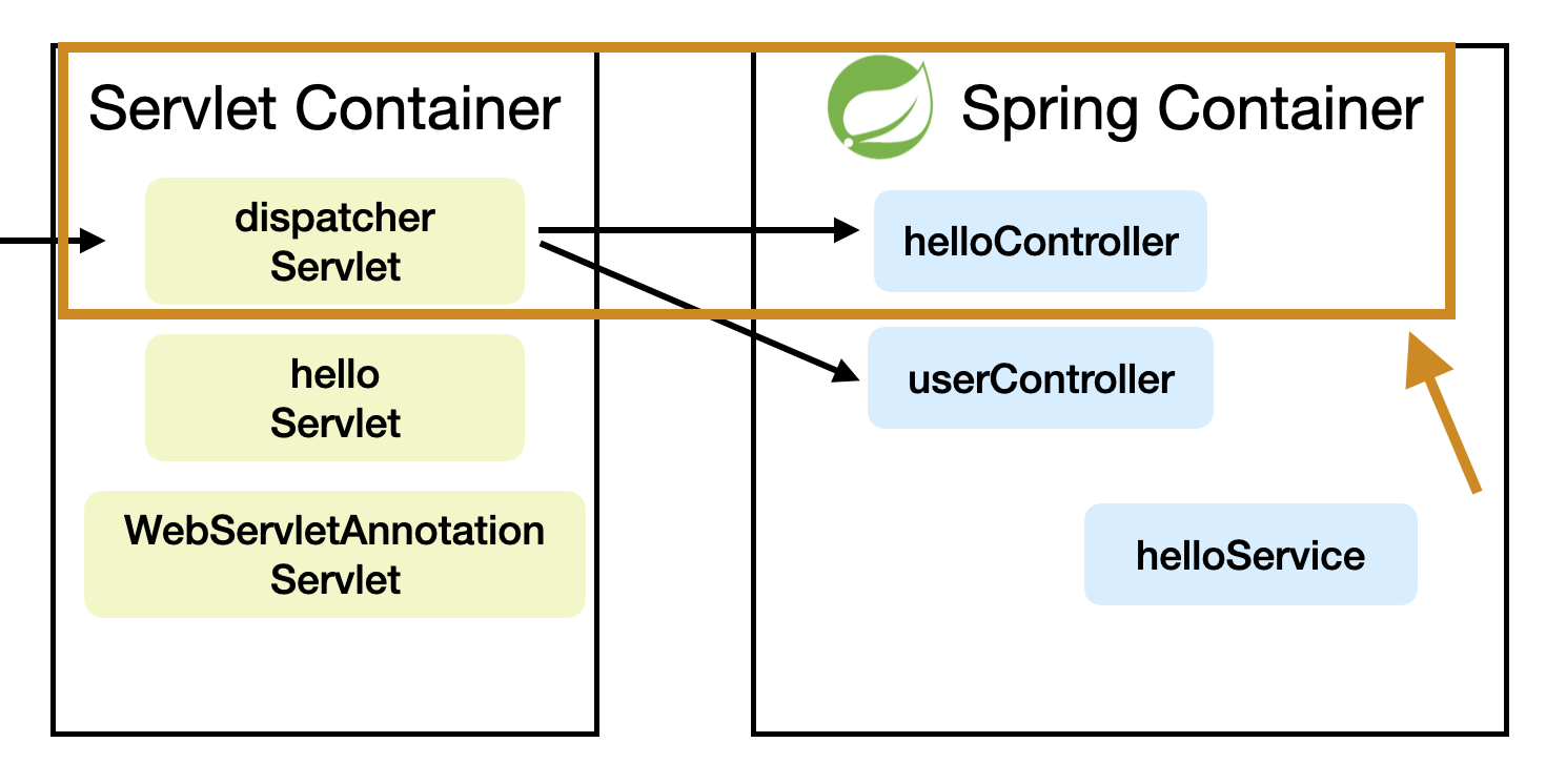 AnnotationConfigWebApplicationContext을 통해서 스프링 컨테이너를 만들고 아까 만들었던 @Bean등록했던 HelloConfig.class를 appContext에 등록한다. 이렇게 하면 스프링 컨테이너가 만들어졌다. 아래 그림 상자가 만들어진것이다. 그리고서 HelloConfig에서 HelloController를 Bean등록하였기 때문에 아래 그림처럼 컨트롤러가 들어가있다.