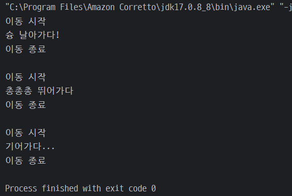 Human 객체는 로봇객체를 만들어서 실제 움직이는 메서드를 실행한다. 여기서 어떻게 움직이느냐는 전략에 따라 달라진다. 익명 클래스를 파라미터로 받아가지고 예제 파일에서는 실행하였다.
