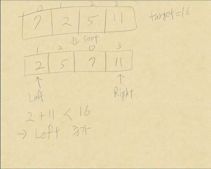 -> 이 경우는 left + right의 값이 target보다 작기 때문에 left를 +1 증가해서 target의 값에 근접하도록 조정한다.