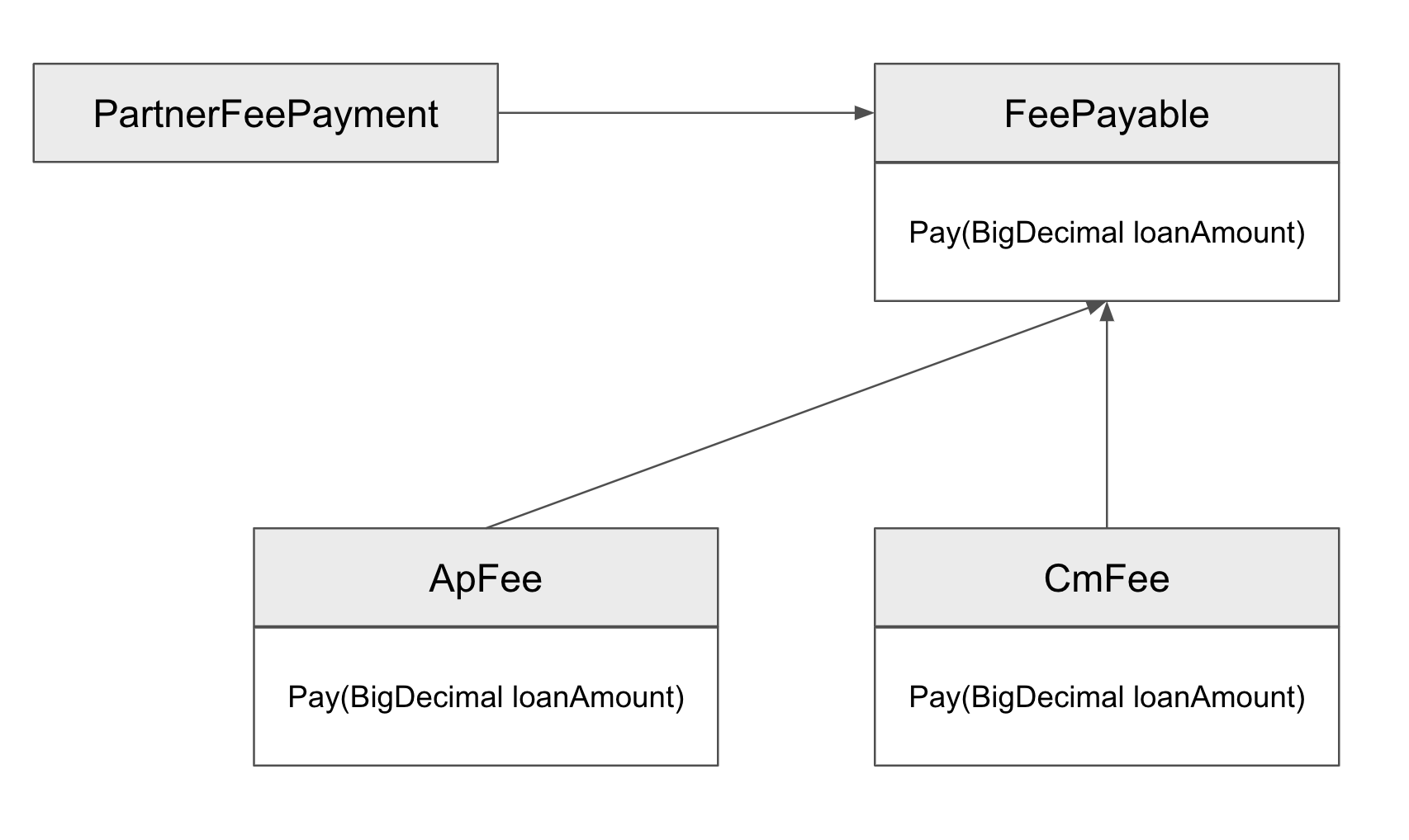 이렇게 그려보았는데 PartnerFeePayment라는 클래스는 FeePayable을 의존한다. 여기서 Ap수수료를 받을것인지 Cm수수료를 받을 것인지 결정한다. 글로만 설명하면 잘 이해 못할수 있다. 소스로 한번 보자!