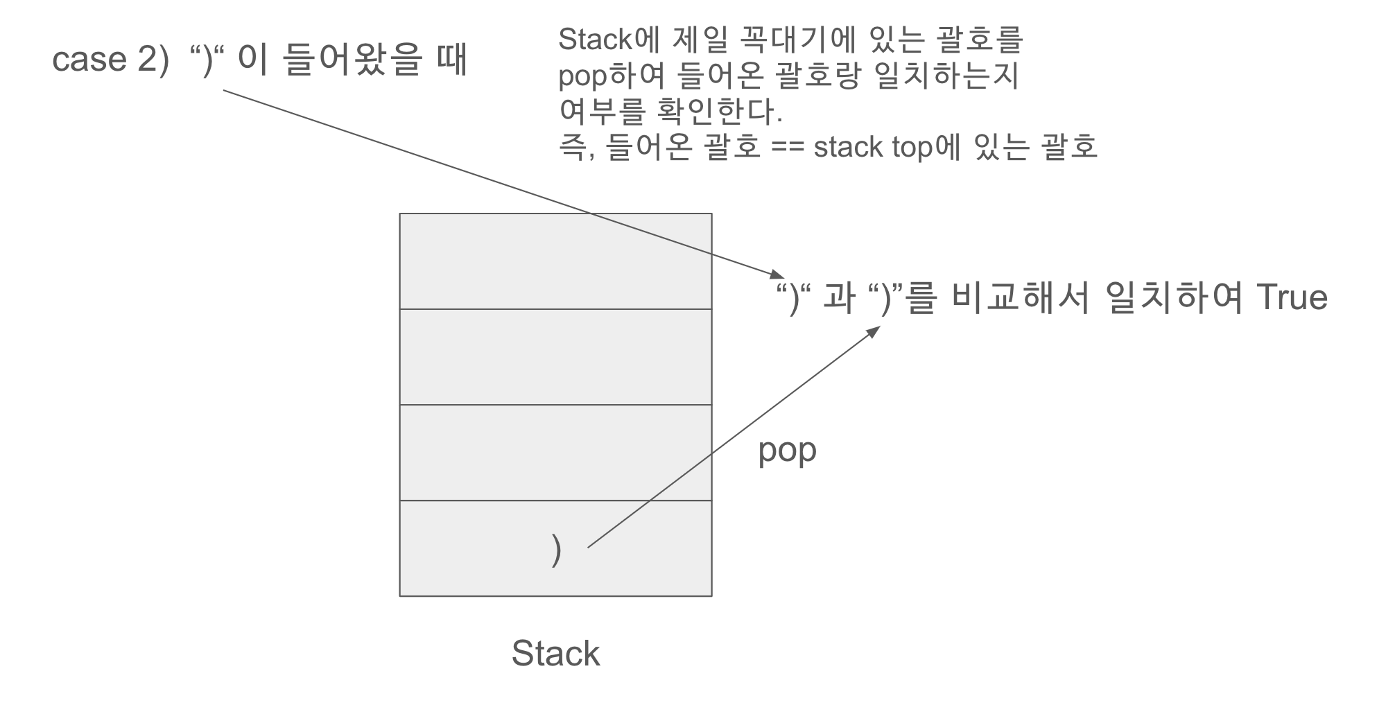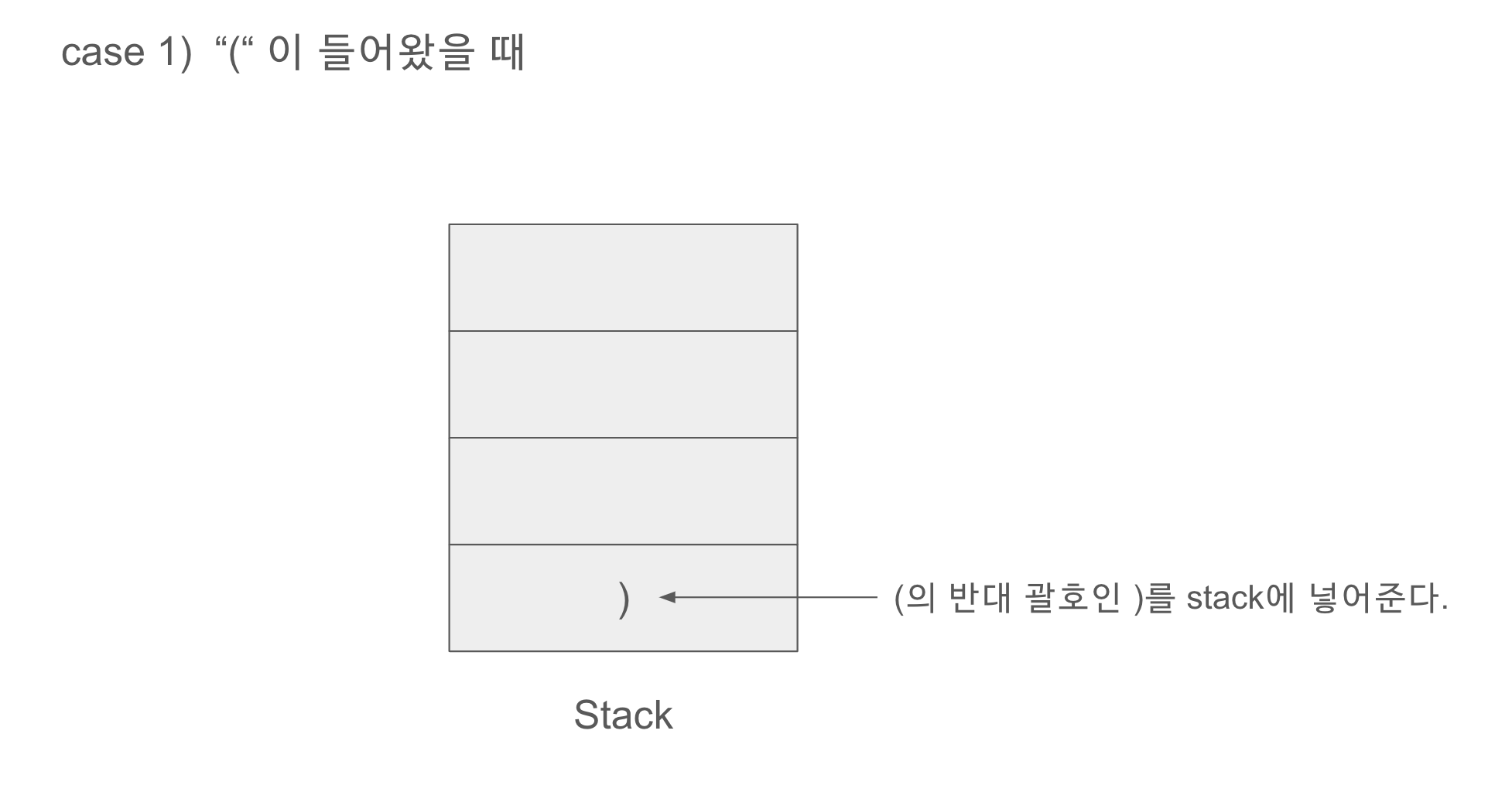 먼저 "("이 들어오면 괄호 반대부호인 ")"를 stack.push를 해준다. stack을 그림으로 표시하자면 아래 그림과 같다.