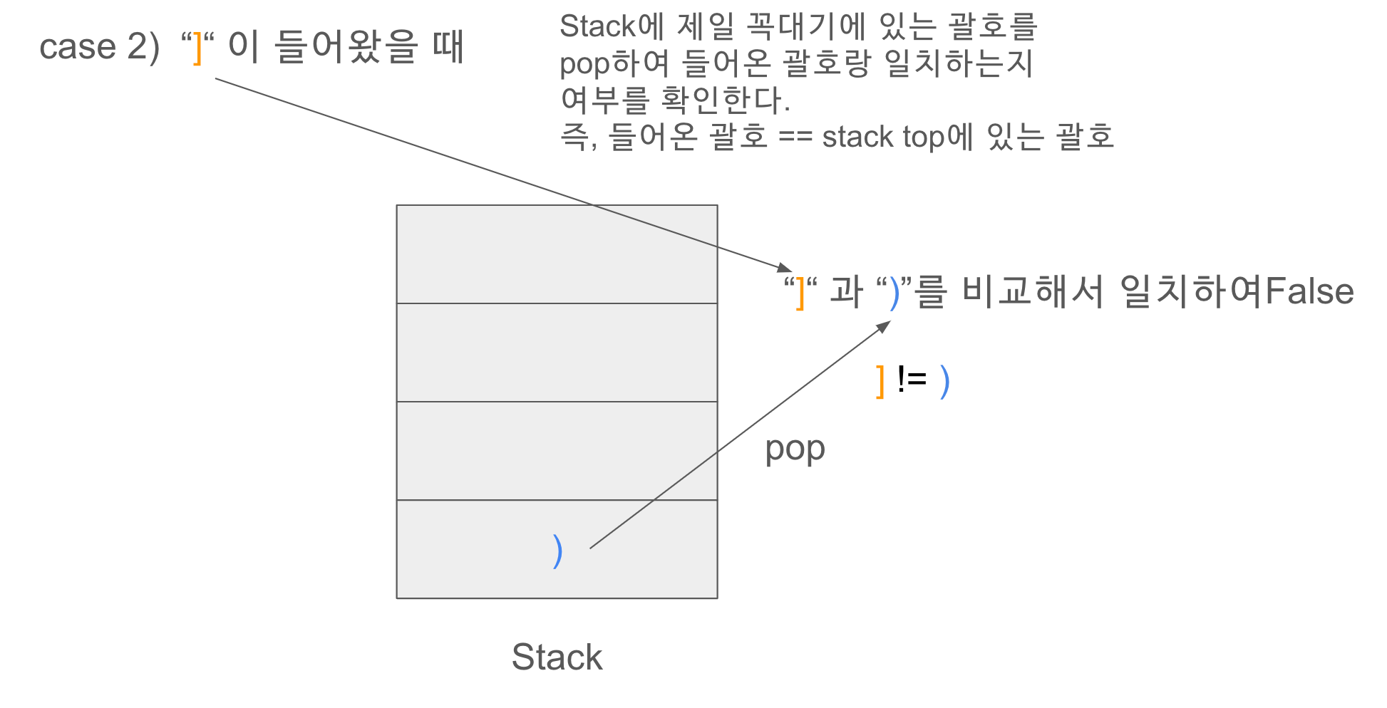 2) 괄호 "), ], }"이 들어올 때 stack에 있는 정보(pop)가 해당 괄호와 일치하지 않거나 stack이 비어있다면 False를 출력한다.